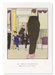 Une scène de salon de mode, où une femme portant le manteau Worth est observée par un groupe de personnages élégants, reflétant l’atmosphère sophistiquée et mondaine de l’époque. Le titre, « Le Choix Difficile », fait allusion aux dilemmes stylistiques auxquels étaient confrontées les femmes de la haute société face à de nombreuses options luxueuses.